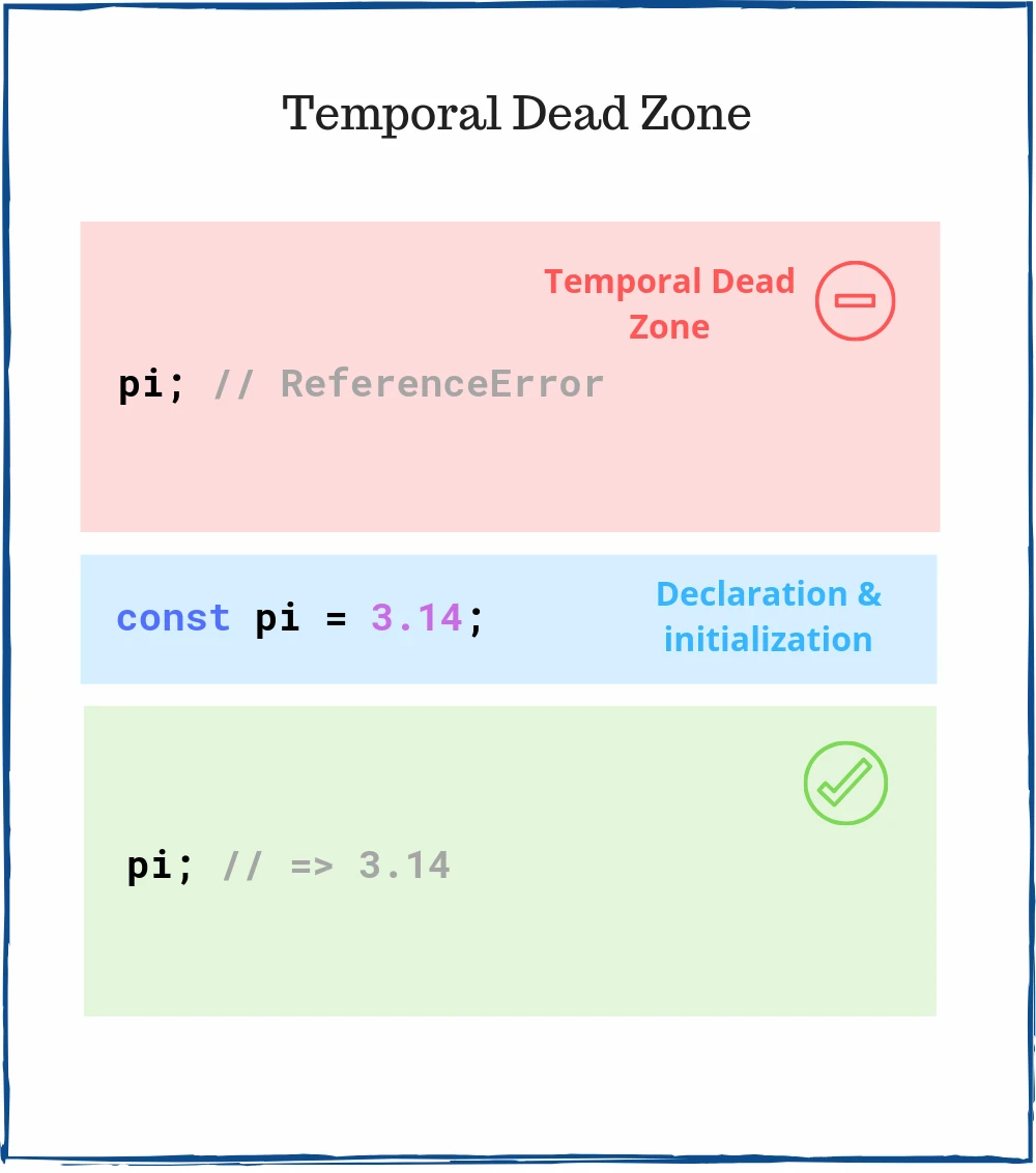 이름에서 알 수 있듯 TDZ는 Zone 즉, 지역을 의미한다. TDZ는 구문(let, const, class 등)의 호이스팅으로 선언만 되고 초기화 되지 않은 지역을 의미한다.
