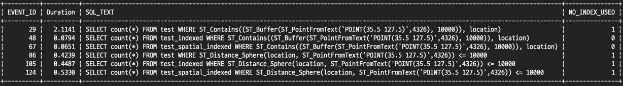 인덱스를 사용한 테이블에서 `ST_Buffer()`를 사용한 쿼리가 0.06 ~ 0.08 초 대로 가장 빨랐습니다.