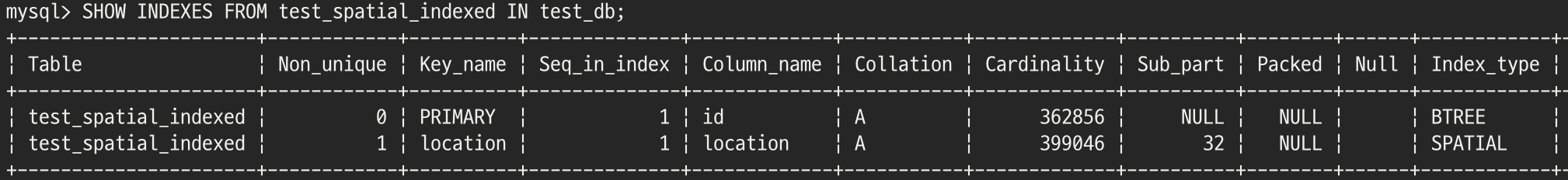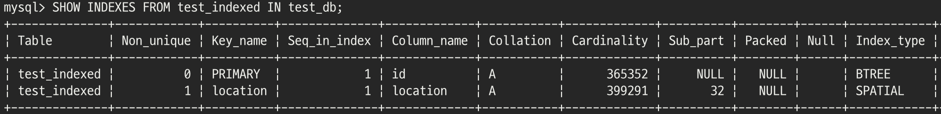 `test_indexed`와 `test_spatial_indexed`를 보면 모두 공간 인덱스가 생성된 것을 확인 할 수 있습니다. InnoDB가 자동으로 `test_inexed`의 비공간 인덱스를 공간 인덱스로 생성한 것 같습니다.