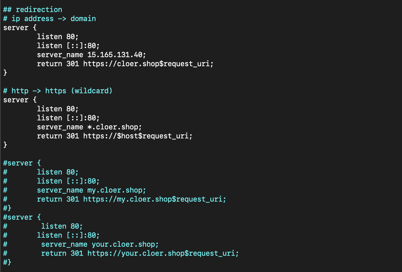 + 추가 server_name을 wildcard로 했을때 return을 어떻게 해야할지 몰라 서브 도메인마다 server 블럭을 만들었는데 $host로 하면 된다. www도 wildcard에 넣어서 서브도메인과 www를 한번에 처리했다. 위에 서브도메인 경로를 설정해준 server block도 *.cloer.shop 과 $host를 이용해 합쳐서 작성 할 수 있을것 같지만 존재하지 않는 서브 도메인으로 접근할 경우 예외 처리도 해야할 것같아서 그냥 두고 redirection부분만 수정했다.