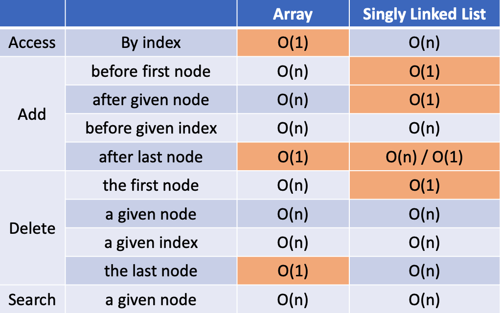 단일 연결 리스트의 마지막에 추가하는 것은 마지막 노드의 주소를 기억하는 방법으로 상수시간으로 줄일 수 있습니다. 하지만 마지막 요소 삭제는 선형 시간이 소요됩니다. 삭제는 직전 요소를 알아야하지만 마지막 요소에서 직전요소를 알 수 없어 결국 첫 요소부터 탐색해야 하기 때문입니다. 따라서 추가/삭제가 잦고 전체 양을 모르거나 변동이 심한 데이터의 경우 연결 리스트를 사용하는 것이 좋습니다.